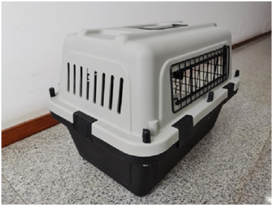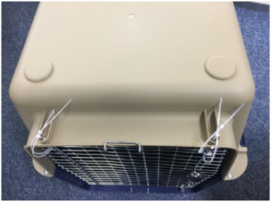 Vous devez préparer une cage de transport pour votre animal de compagnie, répondant aux exigences de la compagnie aérienne (Figure 1), et la sécuriser de manière appropriée (Figure 2).