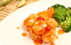 Crevettes de mer fraîches et sauce Kongpao. Légèrement épicé. Les crevettes de mer sont riches en protéines, en graisses, en vitamines A, B1, B2 et B3, en calcium, en phosphore et en fer.