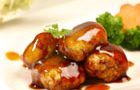 Les boulettes de panga et la sauce rouge sont frites ensemble. La chair du poisson est tendre et savoureuse, et le mélange du poisson et de la sauce très parfumé. Le panga est riche en protéines, en minéraux et en vitamines solubles dans les lipides.